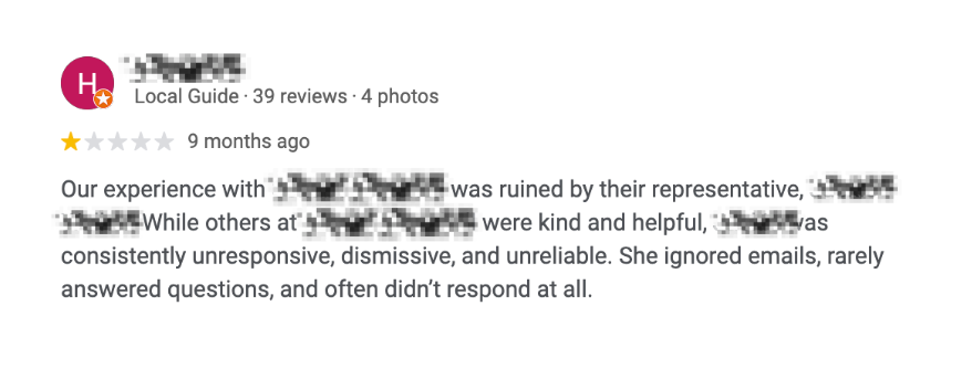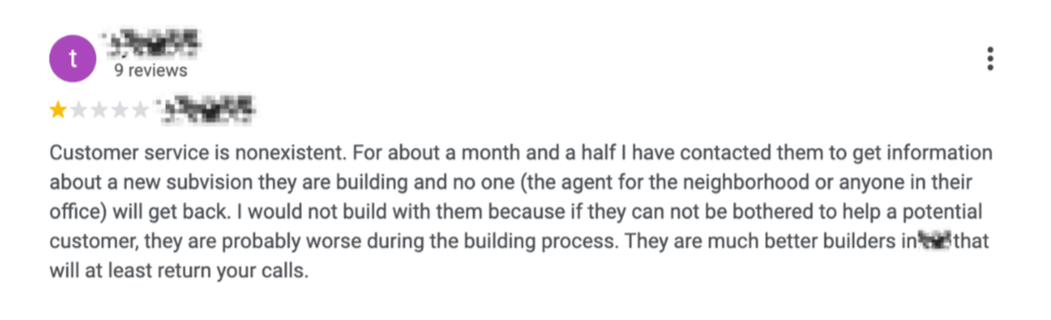 “New home sales agent ignored emails and often didn’t respond at all.”